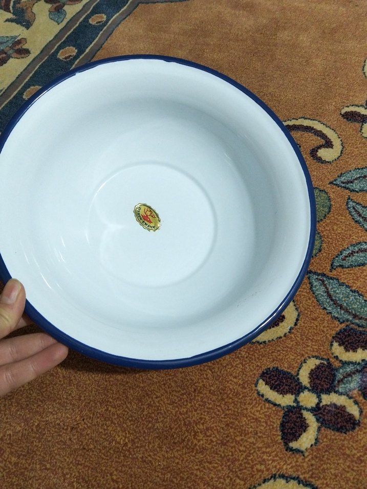 Mavi kenarlı, renkli emaye yemek kabı. Pürüzsüz ve dayanıklı yüzeye sahiptir, mutfakta çeşitli kullanımlar için uygundur. ️