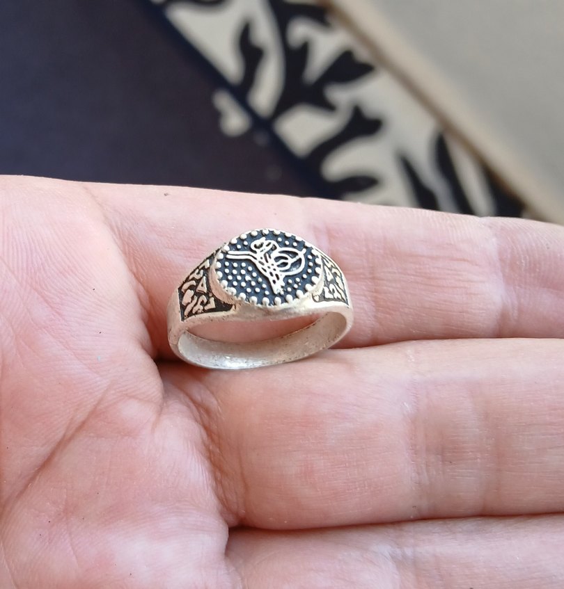 Vintage erkek yüzüğü, altın renkli ve gri desenli merkez ile sade ve klasik tarza uygun detaylara sahiptir.