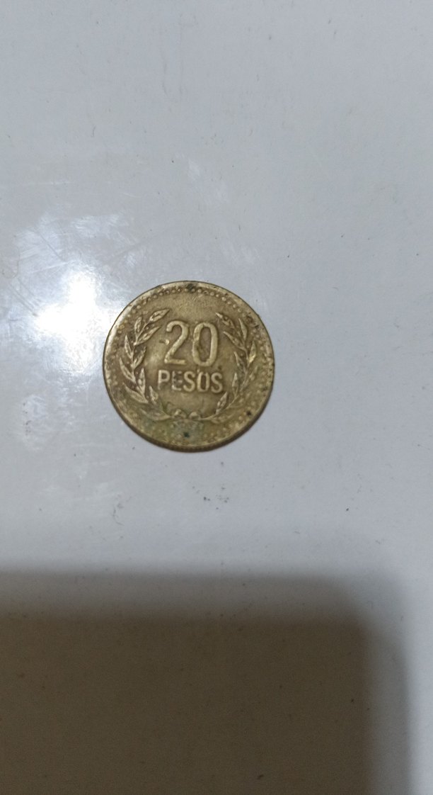 Üzerinde '20 PESOS' yazısı ve defne dalı motifi bulunan vintage altın renkli erkek rozeti, retro karşı kültür tarzını yansıtıyor.