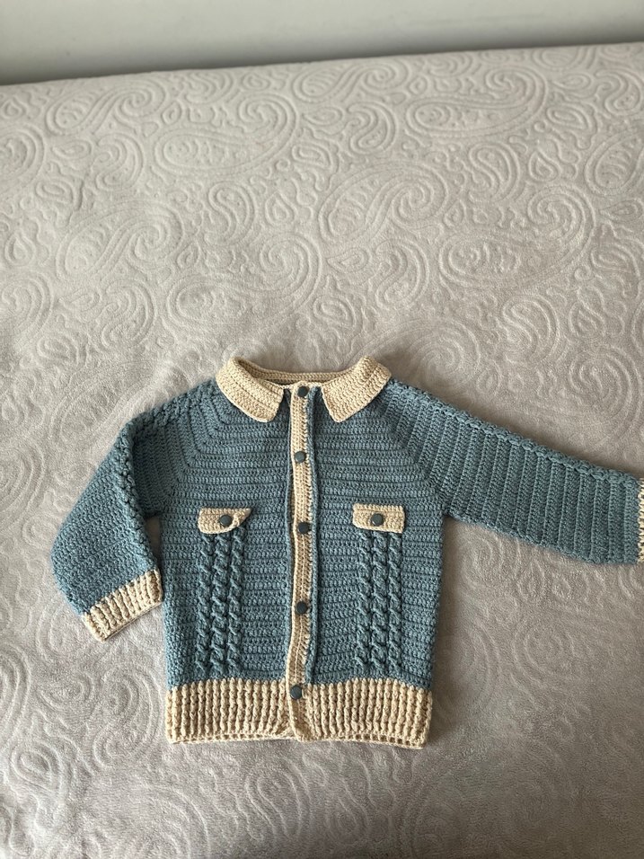 Vintage tarzda, mavi ve bej renklerde, uzun kollu, düğmeli, cepli erkek çocuk triko hırka. Rahat kesimli ve örme kumaştan yapılmıştır. El örgüsüdür 1 yada 2 kez ancak giyildi