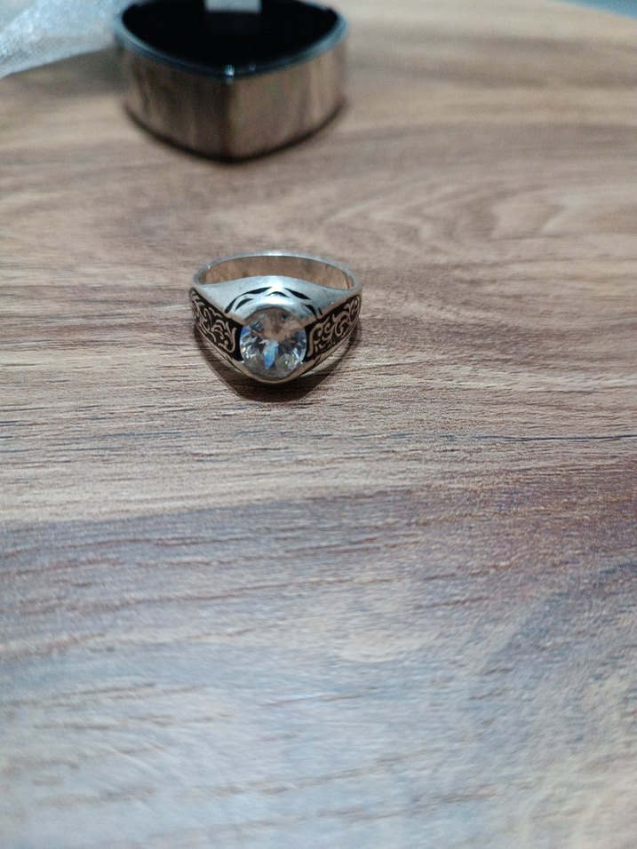 üzeri savatlı. özel bir yüzük. Vintage erkek yüzük, gri taşlı ve bej tonlu klasik işlemeli tasarıma sahip. Geleneksel stiliyle sade ve zamansız bir görünüm sunar.