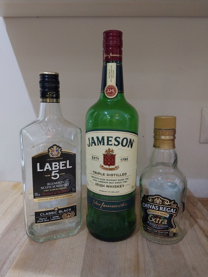 Vintage tarzı erkek kolonyası, açık beyaz renkte ve karşı kültür estetiğine sahip. Şişe üzerinde 'JAMESON' ve 'CHIVAS REGAL' yazılı etiketler var.