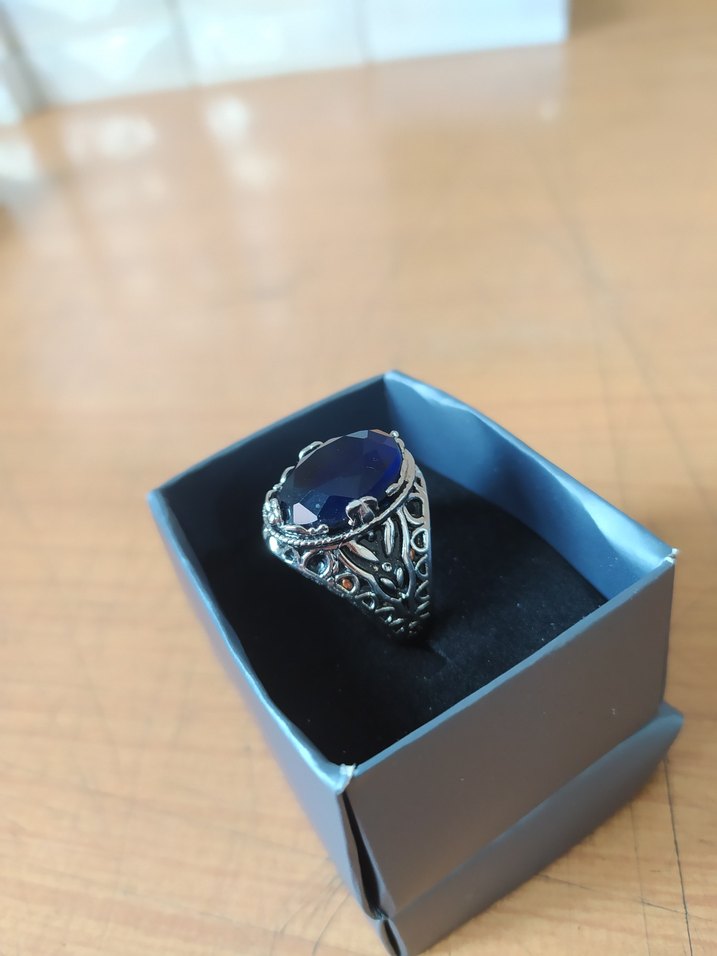 Vintage tarzda, koyu mavi taşlı ve detaylı desenli erkek yüzüğü, sade gotik tarzı yansıtır.
