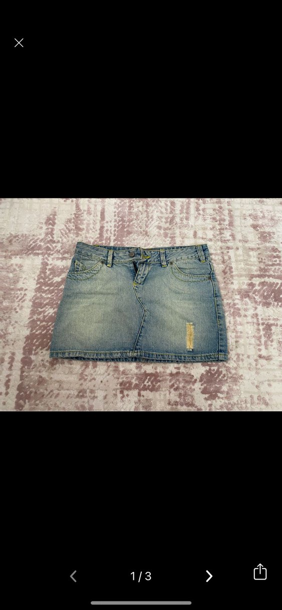 Mavi denim mini etek, bel kemerli ve hafif batik desenli, günlük rahat kullanım için uygun.