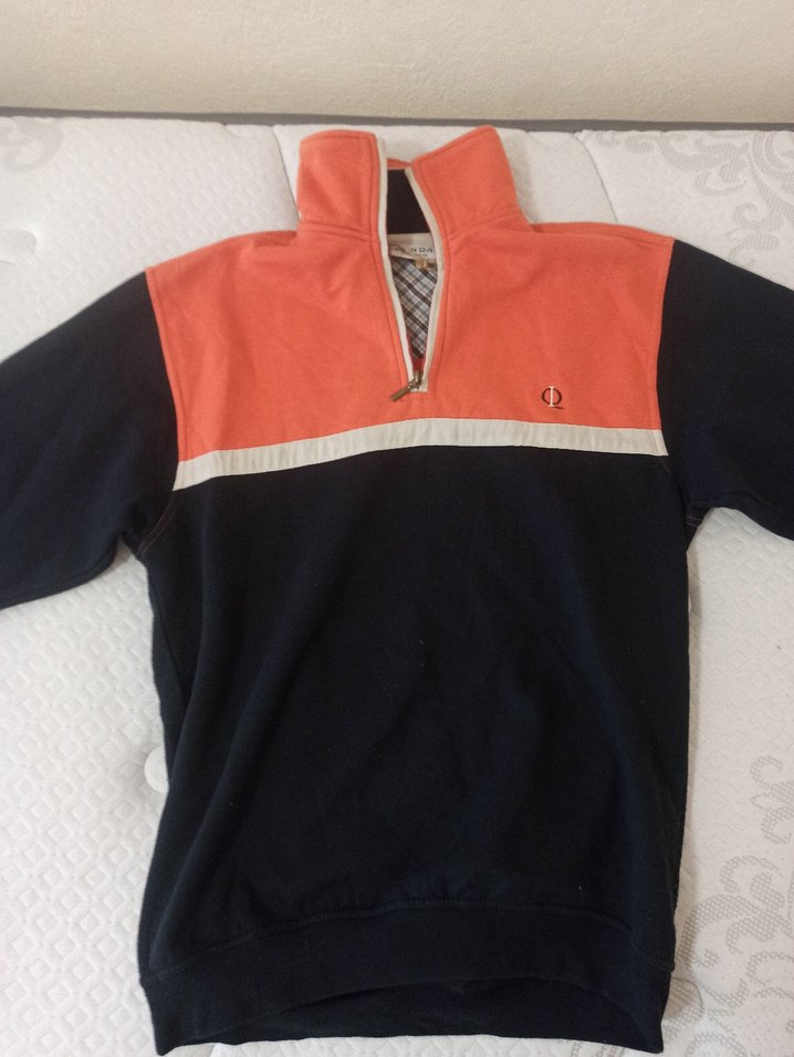 Yarım fermuarlı balıkçı yaka, uzun kollu, yumuşak ve sıcak kumaştan yapılmış, fit kesim erkek sweatshirt. Koyu renkli blok desenli, günlük dış mekan kullanımı için uygun.