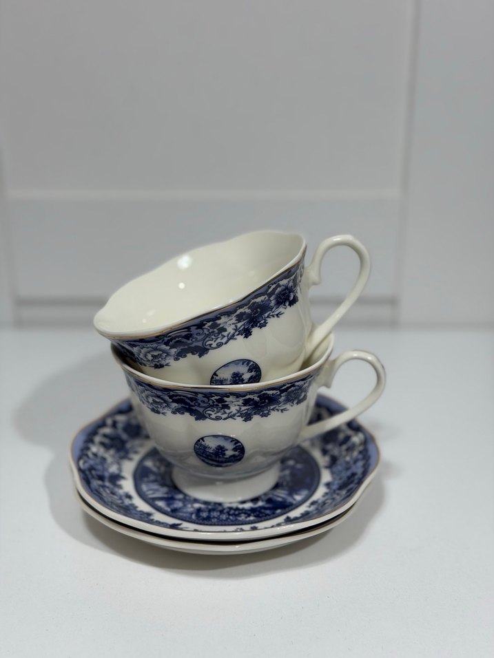 Mavi çiçek desenli seramik fincan ve tabağı içeren, klasik tasarımlı renkli detaylara sahip set. ☕