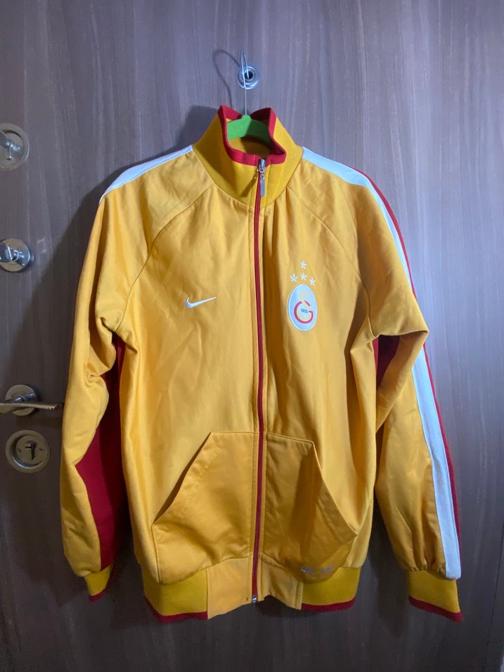 Fermuarlı önü, uzun kollu ve bisiklet yaka detaylı sarı Nike mont. Yumuşak ve parlak kumaştan, kollarda kırmızı ve beyaz şeritlerle sportif tarzda. Son fotoda defosu bulunmaktadır