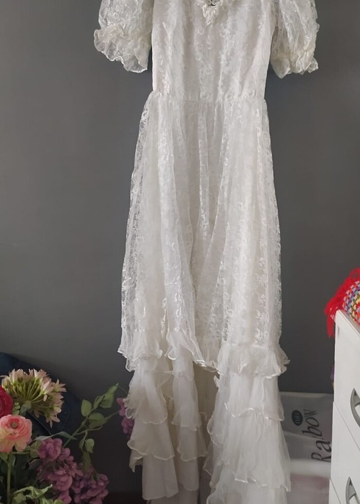 Vintage bir gelinliktir. Dantel detayları fotoğrafda görüldüğü gibidir. Temizleme yapılmıştır. S ve M bedene uyumludur.