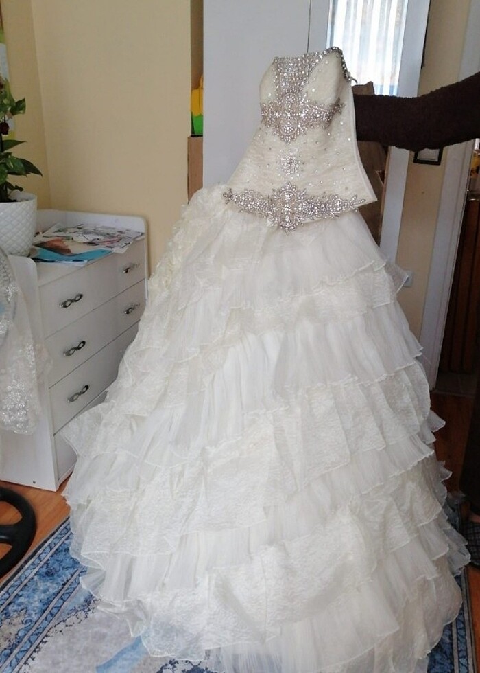 38 bedene uygun özel dikim Gelinlik. (ayarı tamamen sıkıldığında 36 bedene kadar uygundur) 1 kez giyildi temiz muhafaza edildi. Kırık beyaz renginde, içi saten, kat tül görünüme sahip arkası kuyruk modelli gelinlik. Görünürde deformesi yok, fotoğraflarda detaylıca çektim inceleyebilirsiniz. Orijinal halinde, tarlatanı yanında, eşarp boyutunda ek kumaşı mevcut, dilerseniz bluzuda mevcut. Fiyatta yardımcı olunur. #gelinlik #nişan #kına #abiye #elbise #düğün #söz #kıyafet