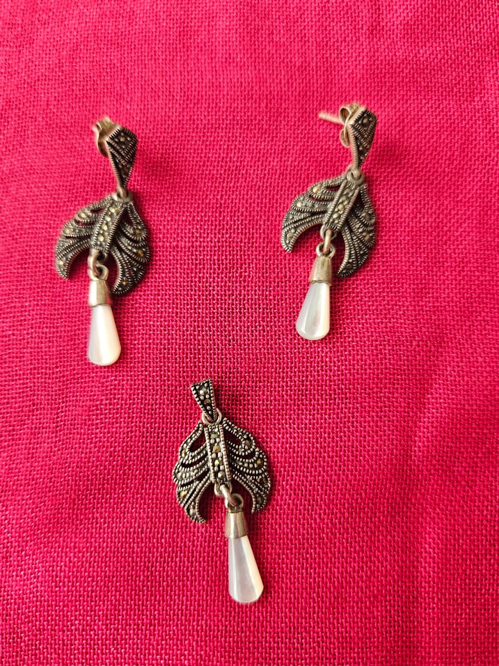 Nakışlı yaprak desenli, markazit ve sedef detaylı vintage küpe ve kolye seti. 925 Ayar Gümüş FIRSAT