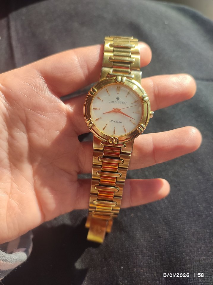 Tertemiz Vintage Gold Steel Saat 22 Ayar Altın Kaplama - Swiss Movt İsviçre Mekanizma Marka/Model: Gold Steel (MDL NO: A96G) Kondisyon: 25 yıldan fazlası olan bir saattir. Fotoğraflarda görüldüğü gibi yaşına göre oldukça temiz durumdadır, Altın kaplamasında belirgin bir aşınma yoktur. Pil takıp güvenle kullanılmaya hazır. Kordonda kısaltma yapılmamıştır. Düğünde takıldı ve sonrasında hiç kullanılmadı. Hem kadın hem erkeğin kullanabileceği bir modeldir. Özellikler: 22 Ayar Altın Kaplama (22K Gold Plated) gövdeye sahiptir. Arka kapağı paslanmaz çeliktir. Mekanizma: İçinde kaliteli İsviçre mekanizması (Swiss Movement) bulunmaktadır. Tasarım: Klasik, ince yapılı, takım elbiseyle veya günlük şık kıyafetlerle uyumlu, zamansız bir modeldir.