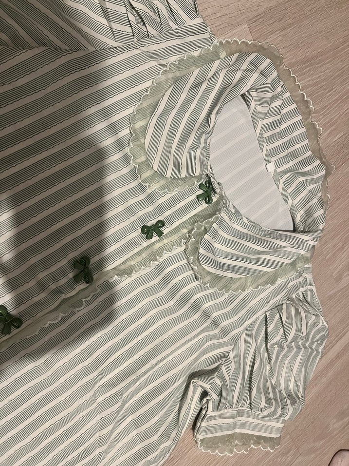 Pastel yeşil, kısa kollu, yakalı, işlemeli detaylı. Çindeyken almıştım oversize duruşu var istedigim gibi durmuyor o yuzden giymiyorum