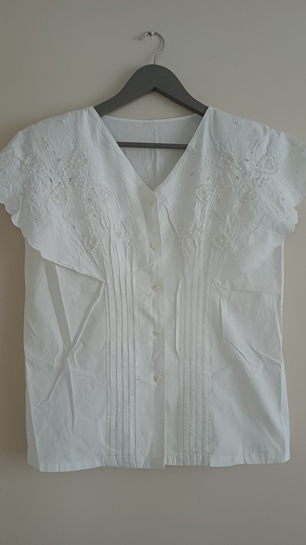 90'lı yıllara ait işlemeli, vatkalı gömlek. Kalıbı çok güzel cuk :) Ön kısmında minik bir lekesi mevcut. Nedir bilmiyorum, durmaya bağlı olarak oluşmuş olabilir. 38-40 beden aralığı olanlar düşünebilir. Fiyat temsilidir. #gömlek #vatka #vintage #beyaz