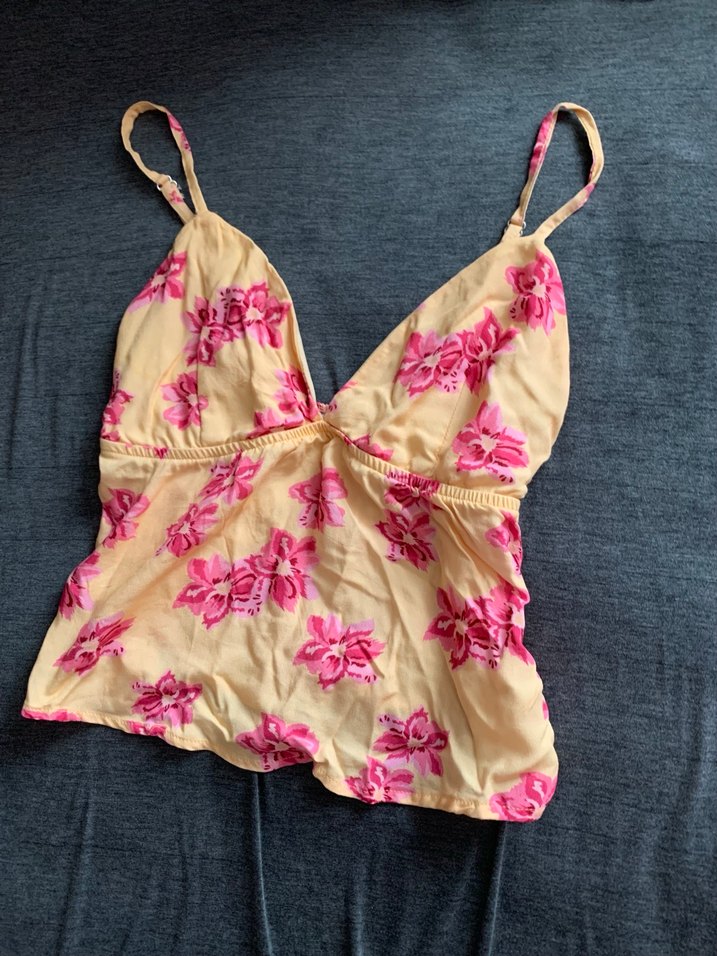 Vintage görünümlü çiçek desenli yumuşak kumaş askılı bluz