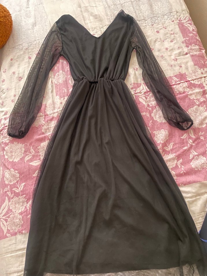 Uzun, siyah renkli, dökümlü kesime sahip elbise; bol kesim ve uzun tüllü kollar ile V yaka detayları bulunur. Yumuşak sentetik kumaştan üretilmiştir, romantik akşamlar için uygundur.