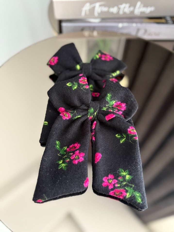 Siyah saç kurdelesi, sentetik kumaş üzerine canlı koyu pembe çiçek desenleriyle vintage gotik tarz sunar.
