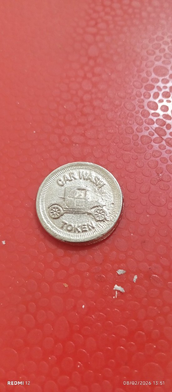 Klasik araba tasarımlı, üzerinde 'CAR WASH TOKEN' yazan gri metal vintage rozet. Eski ve karşı kültür tarzına uygun görünüme sahip.