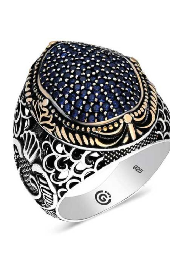Gri vintage tasarıma sahip erkek yüzüğü, üzerinde mavi taşların bulunduğu detaylı desenlerle klasik bir şıklık sunar. 925 ayar gümüşten üretilmiştir.