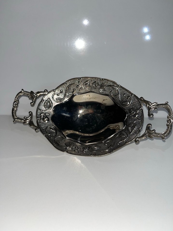 Vintage gri tepsi,şekerlik dekorluk parlak yüzeyde detaylı yılan deseni ve süslü kulplar ile klasik bir dokunuş sağlar.