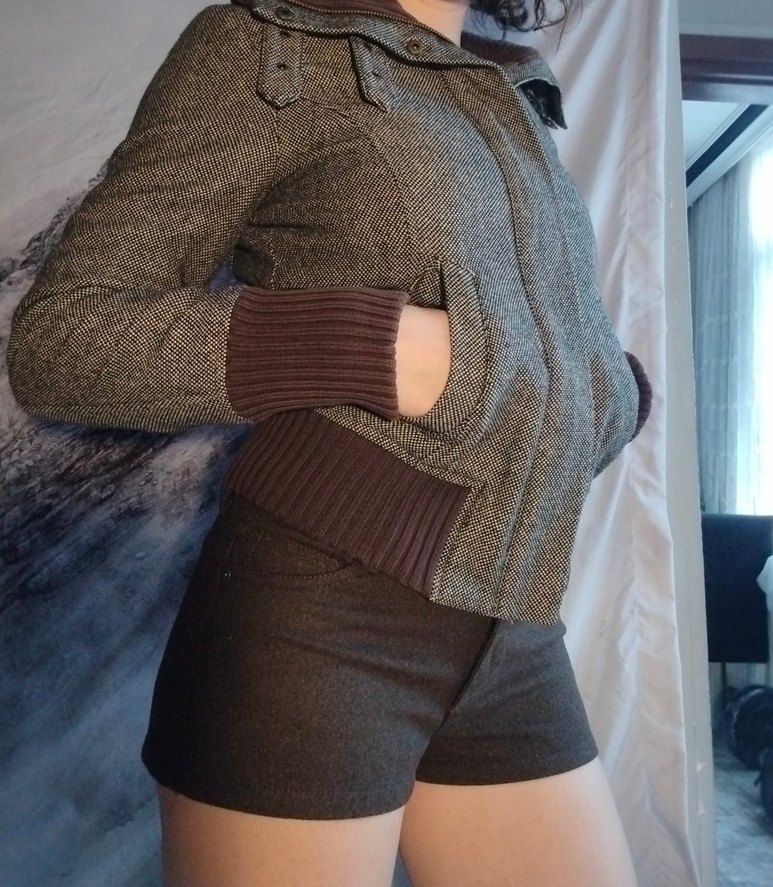Yüksek yakalı, uzun kollu, gri yün örgüden yapılmış, fit kesim kısa kadın ceketi. Ribanalı manşet ve eteğe sahiptir, günlük sokak stili için uygundur.