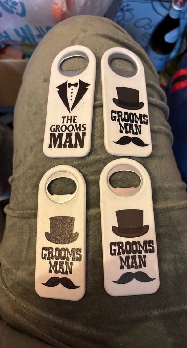Klasik smokin ve fötr şapka desenli beyaz ve gri vintage damat yancısı açacak. Her biri açacak fonksiyonlu ve büyük "Grooms Man" yazılı.