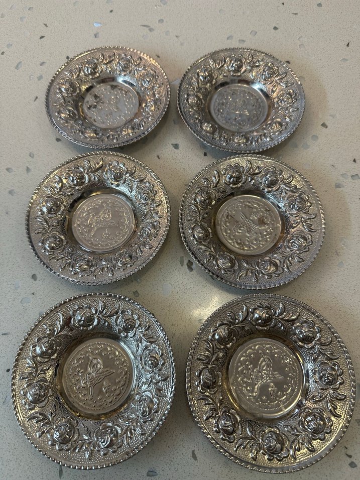 Gümüş 6 adet tura desenli kabartmalı dekoratif tabak seti eskilerden kalmadır iki tanesinde atık vardır #vintage çay tabağı#