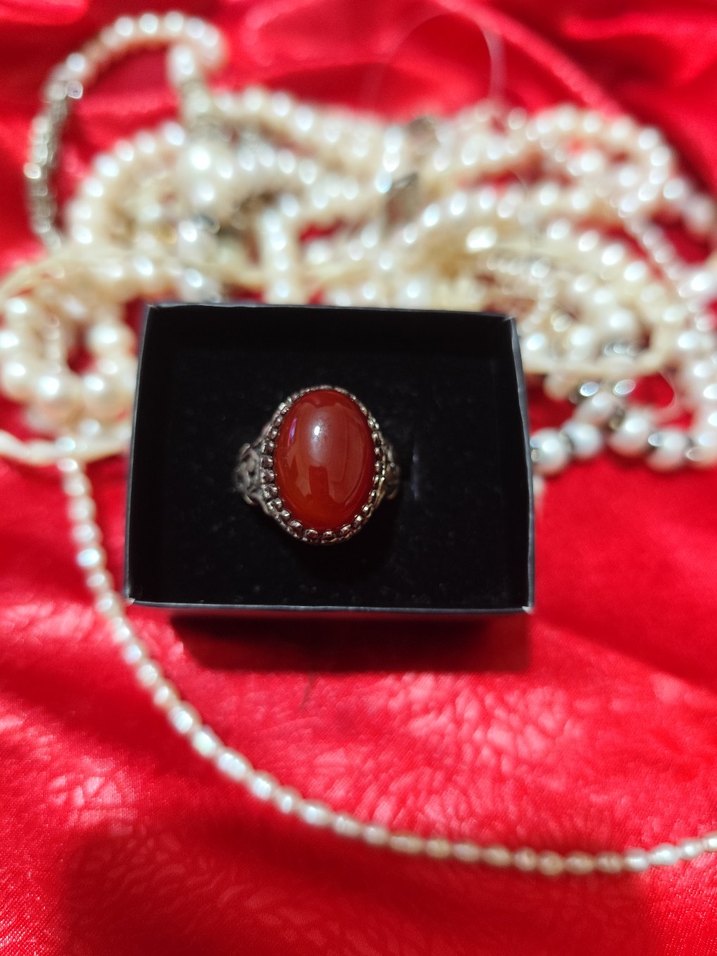 Bohem tarzı otantik gümüş akik taşlı erkek yüzüğü el yapımı Detaylı gümüş görünümlü bant üzerinde canlı kırmızı taş bulunan klasik tasarım erkek yüzük.