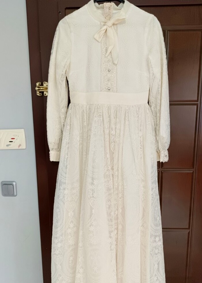 Sadece düğün salonunda o da 3-4 saatliğine giyildi. Hiç bir sıkıntısı yok. Kuru temizleme olmadı. Taftasını yanında göndereceğim. Duvağı çok uzun. Bursa'da mahanne adında bir butikten almıştım.rengi ekru. Ucuz bir şey olmadığı ve yeni evlenecek insanları üzmek istemediğim için beden konusunda sıkıntı çıkarsa teslimatla aynı gün içinde olmak kaydıyla geri iade kabul edebilirim.