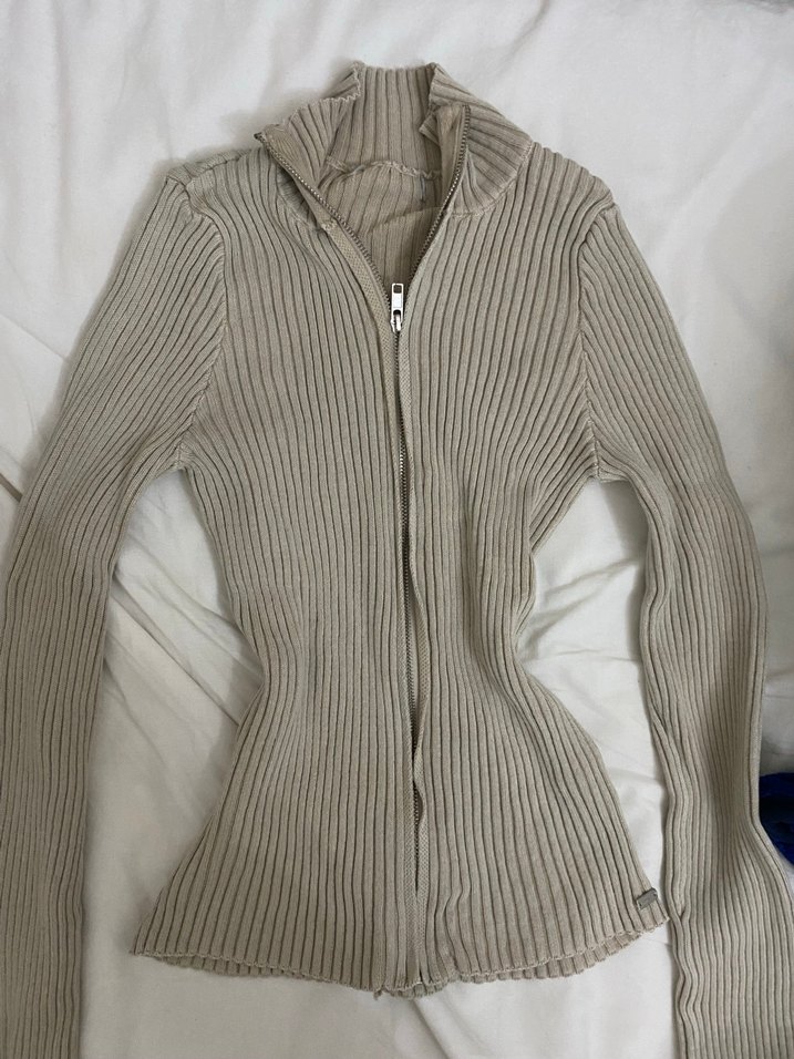 Bej renkli, fitilli örgü kadın triko, yüksek yakalı ve uzun kolludur. Yumuşak keten kumaştan yapılmış, günlük rahat kullanıma uygun normal boyda ve desensizdir.