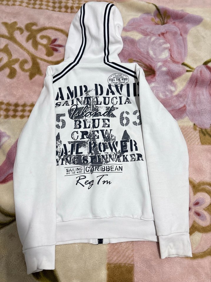 Beyaz pamuklu sweatshirt, bol kesim, uzun kollu ve fermuarlı. Siyah çizgili kapüşon ve sırtında baskılı yazılar bulunur. Rahat günlük stil için uygundur.