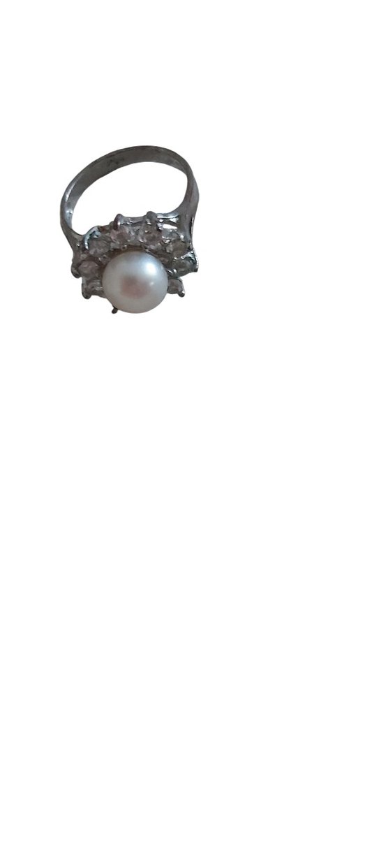 Vintage tarzda, suni inci ve küçük taşlarla bezenmiş beyaz yüzük.