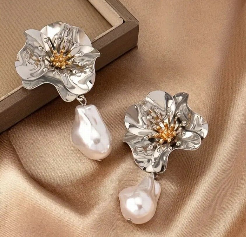 vintage tarzda çiçek tasarımlı, altın kaplama inci küpe hem şık ve havalı