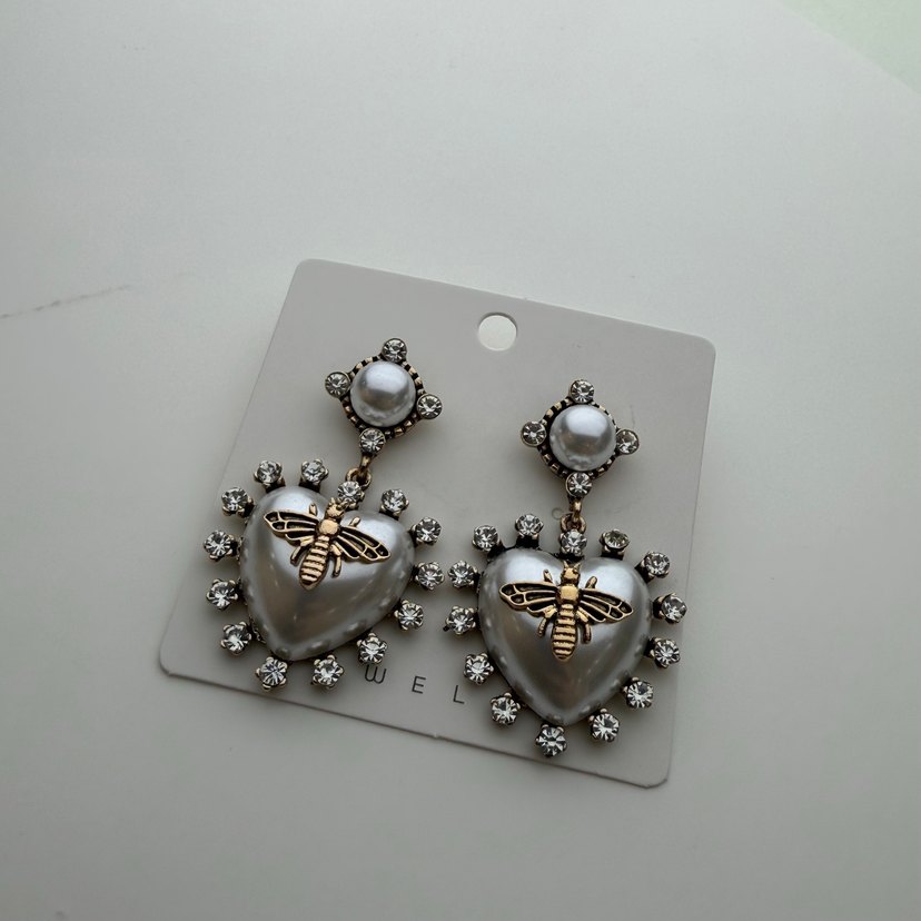 İnci detaylı, arı figürlü nakışlı kalp tasarımlı vintage bohem küpeler. Küçük taşlarla çevrili, düğünler için klasik zarafet sunar.