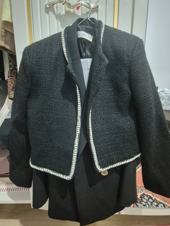 inci detaylı siyah tüvit ceket ve uzun kollu, ofis için uygun, Paris modasına uygun. vintage