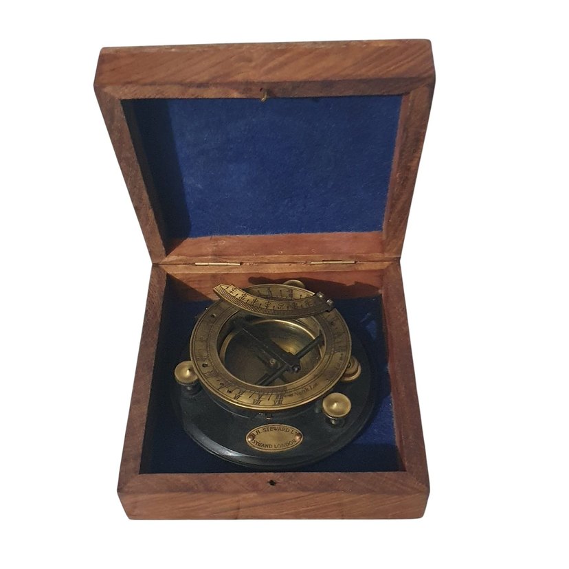 Ahşap kutu içinde, mavi iç astarlı, koyu tabanlı altın renkli pusula. Vintage tarzıyla kullanışlı bir üründür. ⚖️, 4×12 cm boyutlarında