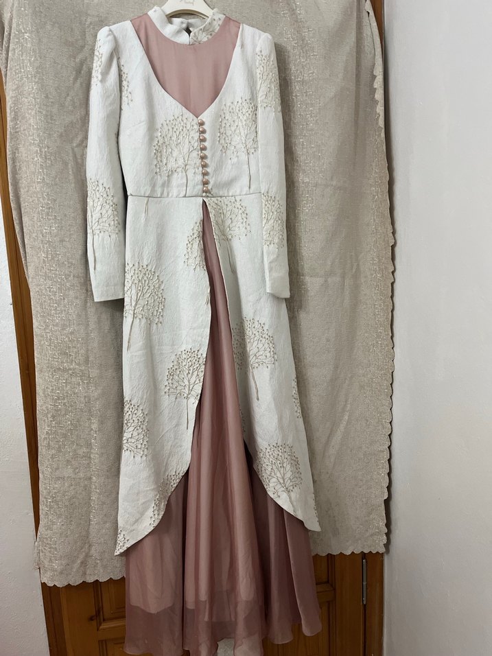 Uzun beyaz kadın elbise, işlemeli detaylar ve drapeli tasarımla, klasik zarafette, yakalı ve uzun kollu olarak sunuluyor.