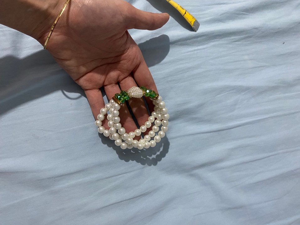 Bohem tarzda, işlemeli detaylar ve yeşil süslemelerle beyaz boncuklardan yapılmış vintage tarzda bileklik. Düğünler için uygun.