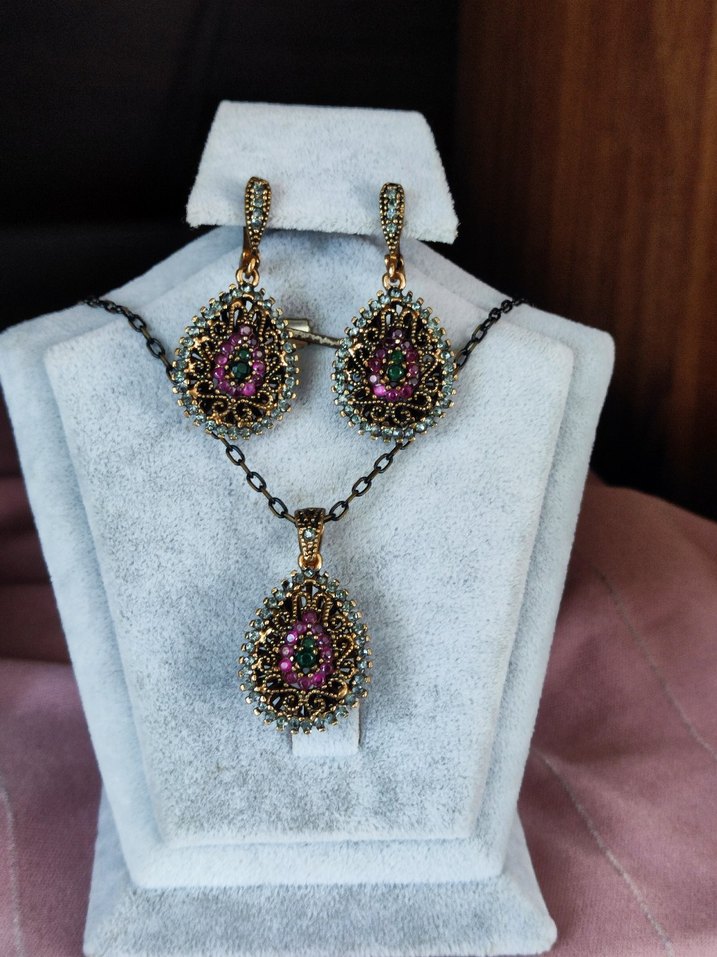 Vintage tarzda,Osmanlı bronz kolye taşlı ve işlemeli çok renkli küpelerden oluşan kadın takı seti, kenar taşlar zirkon iç kısımdaki taşlar kök yakut günlük kullanım için uygundur. kimyasallara karşı dikkatli kullanın , Tek settir