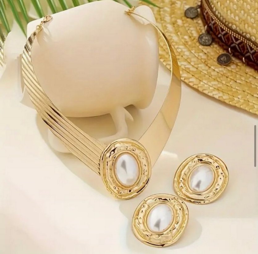 Kadınlar için parlak altın renkli, zincir detaylı ve işlemeli desenlere sahip takı seti. Vintage ve çağdaş tarzı bir araya getirir, düğünlerde kullanıma uygundur. ✨