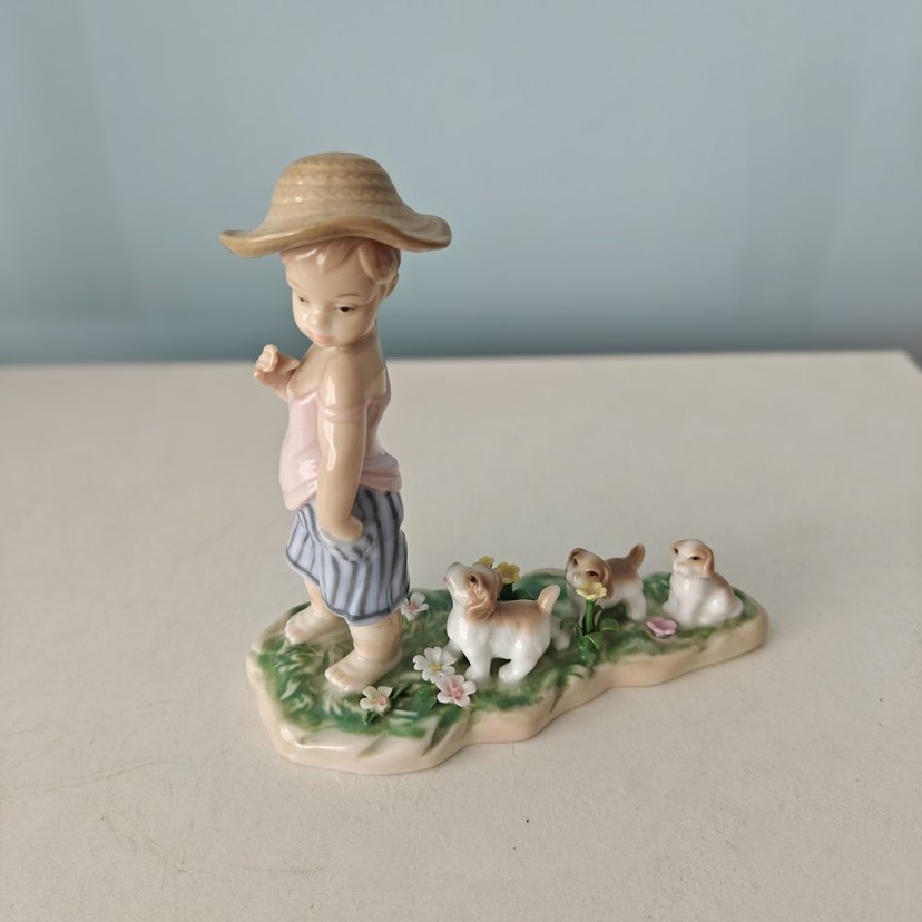 Şapkalı çocuk ve küçük köpeklerin bulunduğu, çiçeklerle süslü pastel renkli figürin. Yumuşak renk tonları ve detaylı işçilik içerir. İtalyan Morena marka, el yapımı. Temiz ve defosuz. Ölçüler resim de verildi. Fiyat son‼️‼️