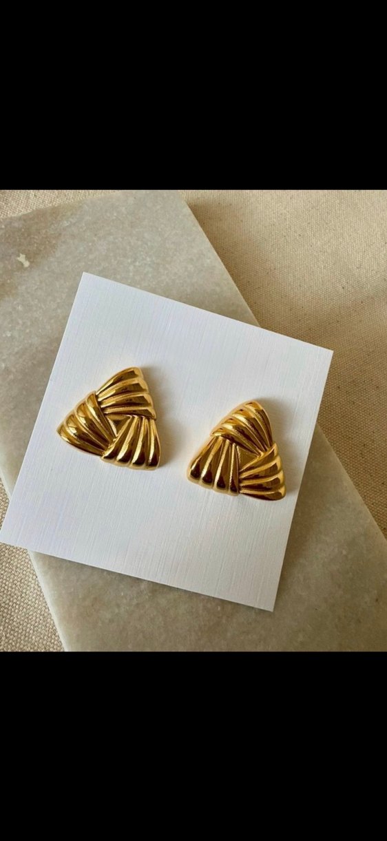 Parlak altın renkli, pliseli üçgen tasarımlı küpeler. Romantik akşamlar için bohem tarzda, klasik şıklık katıyor.