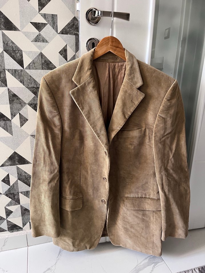 Kahverengi süet malzemeden yapılmış, düğmeli, normal kesim ve uzun kollu erkek ceket. Ofis kullanımı için uygun, klasik sokak stili havasında.
