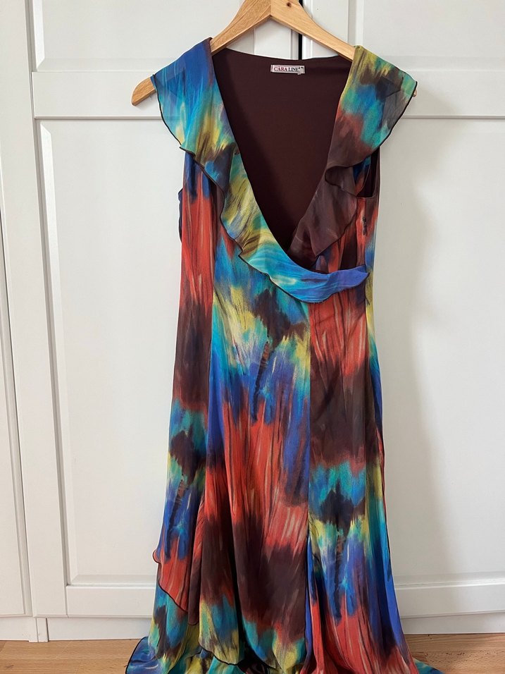 Kadınlar için çok renkli, koyu tonlu batik desenli uzun elbise. Drapeli ve kolsuz, V yaka, ipeksi dokulu, bol kesim parti elbisesi. kumaşı çokk güzel yumuşak slrunsuz