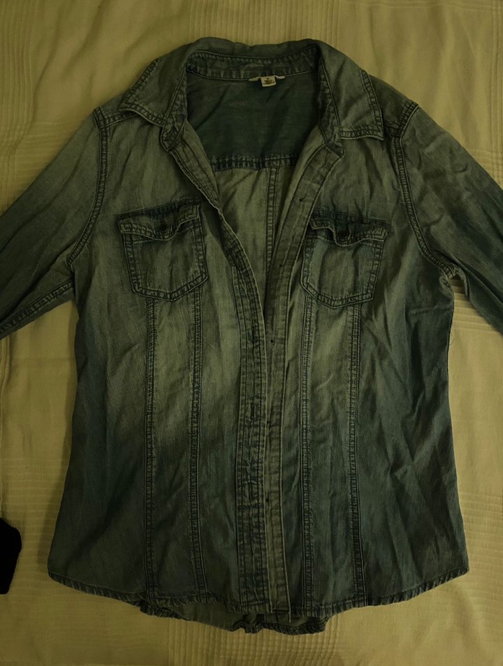 Gri renkli, düğmeli ve notched lapel yakalı kadın denim gömlek. Uzun kollu, bol kesim ve midi boyda, günlük ve sokak stiline uygun.