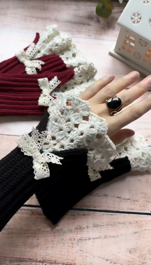 Koyu bordo renkli, dantel detaylı örgü kadın eldiveni. Rahat ve vintage gotik tarzda, klasik bir dokunuş sağlar. renk seçenekleri mevcuttur