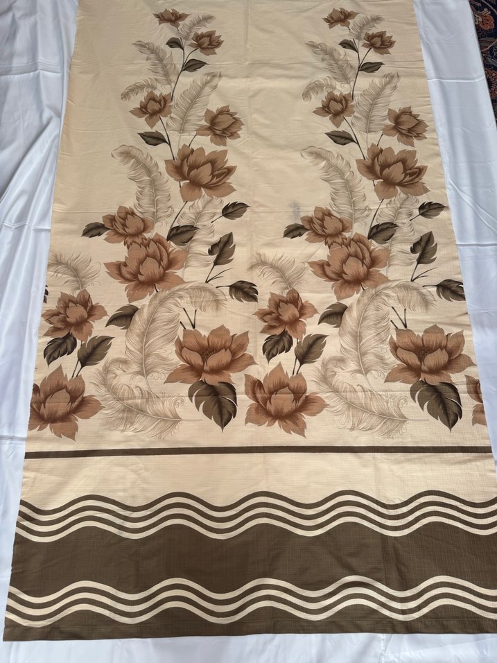 Açık kahverengi zemin üzerinde baskılı çiçek desenleri ve alt kısmında dalgalı desen bulunan geleneksel tarzda perde. 262 cm e 137 cm