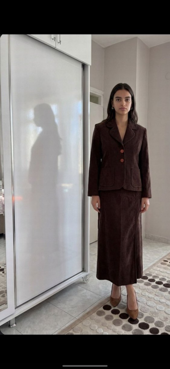 kahverengi fitilli kadife (corduroy) etek-ceket takımı hiçbir defosu solması yoktur. Aslı koyu kahvedir ışıkta daha açık gözüküyor. (Fotoğraf bana aittir izinsiz kullanmayın)