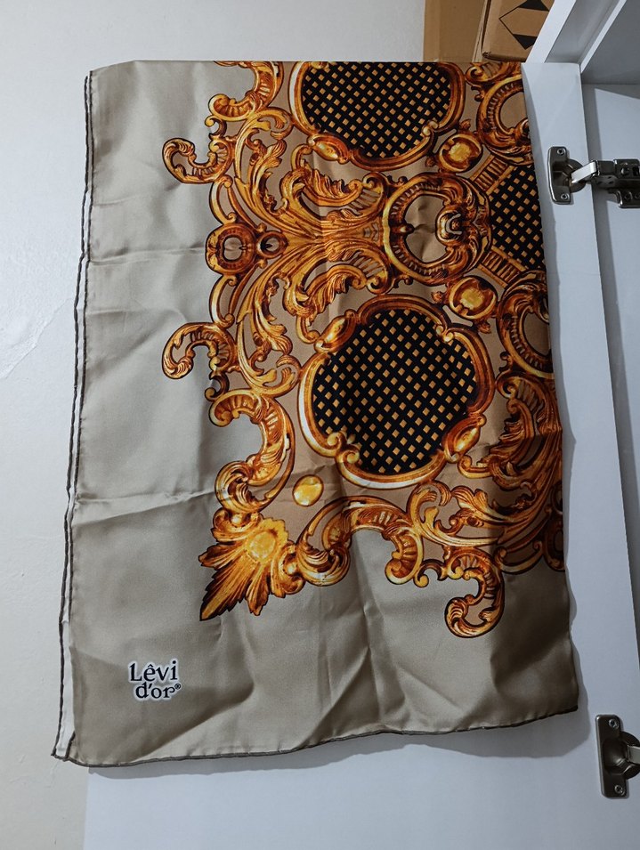 Vintage kahverengi ve gri desenli, ipeksi ve drapeli kadın eşarp Karmaşık desenlere sahip, 'Lévi d'or' imzalı. Bohem ve retro tarzlara uygun.