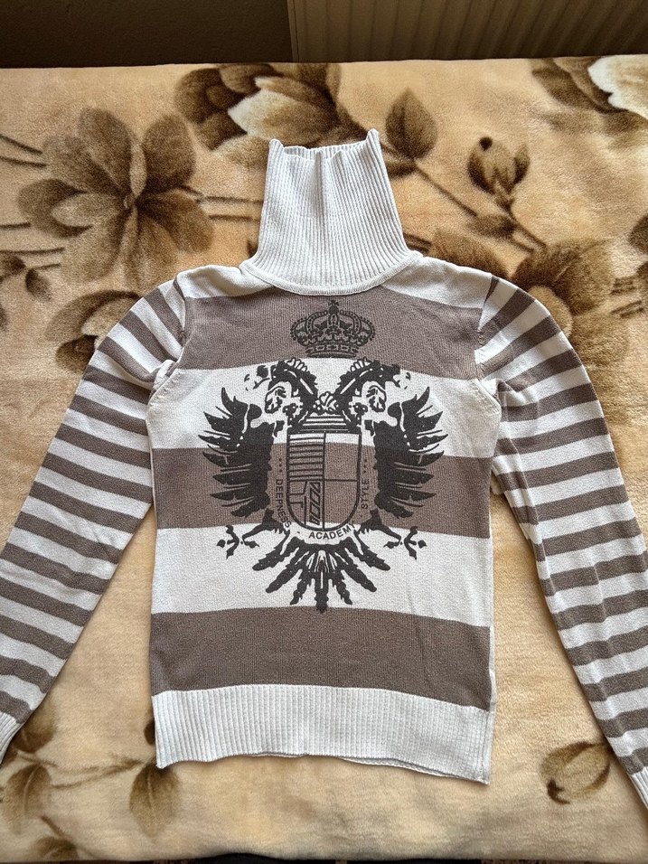 Uzun kollu, dik yaka, yumuşak ve sıcak kumaştan, çizgili ve ortada amblem desenli, günlük kullanıma uygun dar kesim kazak.son fotoğrafta görünen bir lekesi var.dar kalıp olmasına dikkat edin.kazağın tülenmesi yok