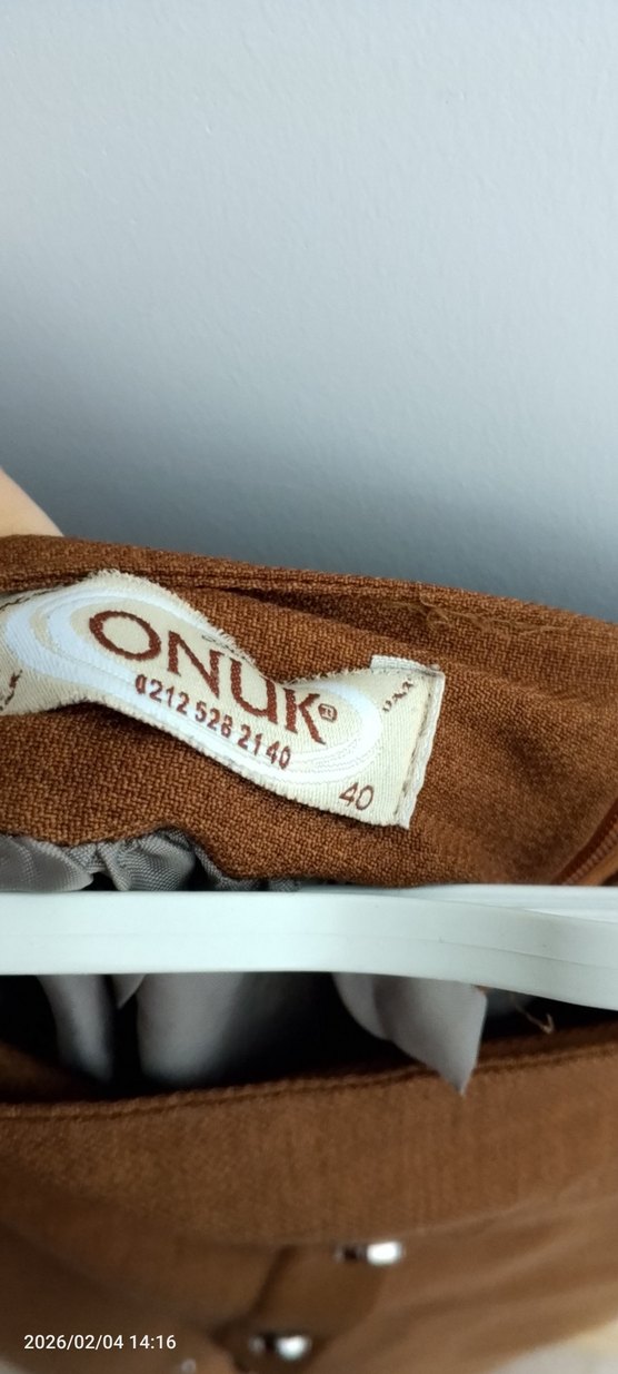Kahverengi ve gri detaylara sahip vintage tarzda erkek askısı. ONUK markalı, 40 beden etiketli klasik tasarım.